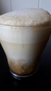 Szerencsére nálunk akad itthon egy kapszulás kávéfőző, aminek van tejhabosító funkciója is (rendes csöves habosító, nem a keverős!), de felteszem más tejhabosítóval is sikerülne a művelet. Eleinte szójatejjel próbálkoztam -szuper lett a végeredmény!- de miután legkisebb lányom erre is allergiás lett, akkor váltottam más növényi tejekre.