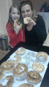 A kurzuson először a kenyérrel kezdtünk, illetve megbeszéltük, mi legyen. Lányom a kiflire és perecre szavazott, így azok készültek, de lehetett volna kenyér vagy croissant is. Könnyű volt követni, mit hogyan kell csinálni -mérni, keverni, dagasztani- és elég gyorsan el is készültek a kelesztésre váró formák. Kaptunk testhezálló tippeket arról is, hogyan tudom majd otthon ezeket kivitelezni egyszerű gázsütőmmel, hogyan érdemes kelesztenem, sütnöm a tésztát.