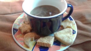 A keksz is csodás lett: megkóstoltam a cukorral készült, cookie-ra emlékeztető csokicseppeset és a mi édesítős cseppmentesünket is. Nagyon mások lettek: míg a cookie-szerű omlós, puha maradt, addig a mi kis édesítősünk ropogósra sült ugyanannyi idő alatt. Nem lett rossz, sőt, mikor a tesók megkóstolták később azt mondták, hogy nagyon finom és nem is akarták abbahagyni az evését -nekem is ízlett és kis kukta-lányomnak is- de tény, hogy nagyon más ízvilágú lett, inkább a kemény teakekszekre emlékeztet az íze. Hazafele a többi családtaggal egy kávézóban futottunk össze -pont egyszerre voltunk ott- és a kávéhoz fantasztikusan ment az íze és a ropogóssága is!