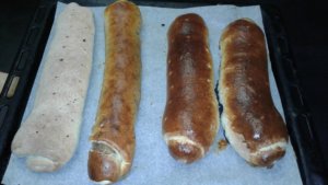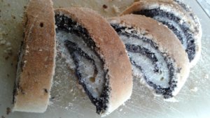 Mindkét sütemény nagyon finom lett -ezek most ugyan tojással készültek, de tervezzük, hogy megpróbáljuk majd a receptet tojásmentesen (len- vagy chia”tojással”, illetve csicserihabbal) elkészíteni. Az egyik rúd bejglinél annyit megtettünk már, hogy nem tojással kentük le, csak olajjal -látszik is, mennyivel sápadtabb lett, mint a többi. Ízre az is remek volt, csak a tojás sárgássága nem barnította meg (bal szélső a képen).